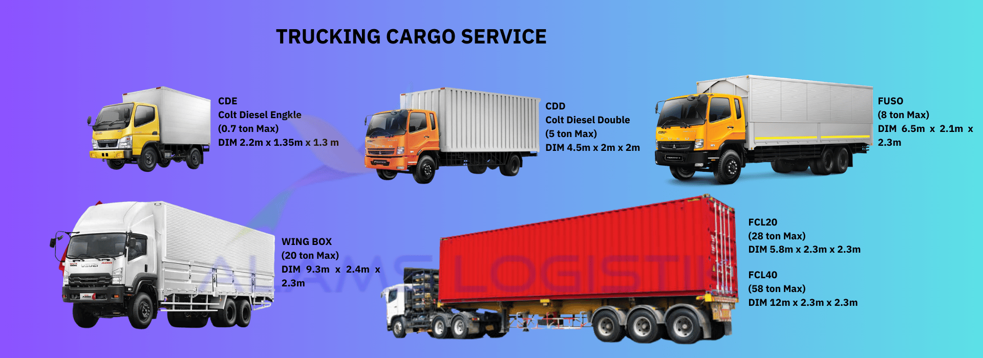 Didukung SDM professional, terlatih dan tersertifikasi, serta ditunjang fasilitas yang memadai, Alams Logistik sebagai perusahaan logistik yang tergabung didalam grup perusahaan Alams memberikan pelayanan yang efektif dan efisien untuk mensukseskan kiriman logistik ke berbagai tujuan dengan metode dan penanganan ekstra sesuai kebutuhan pelanggan.